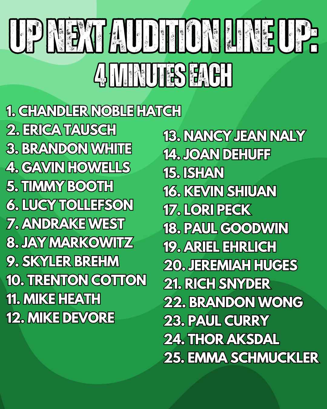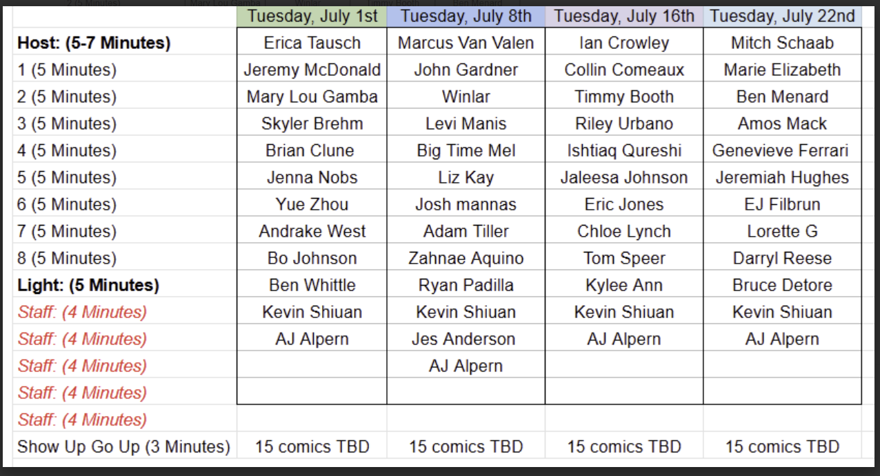 - Monthly Scheduling – Want a guaranteed slot? Submit your availability online to be considered for a 5-minute set.