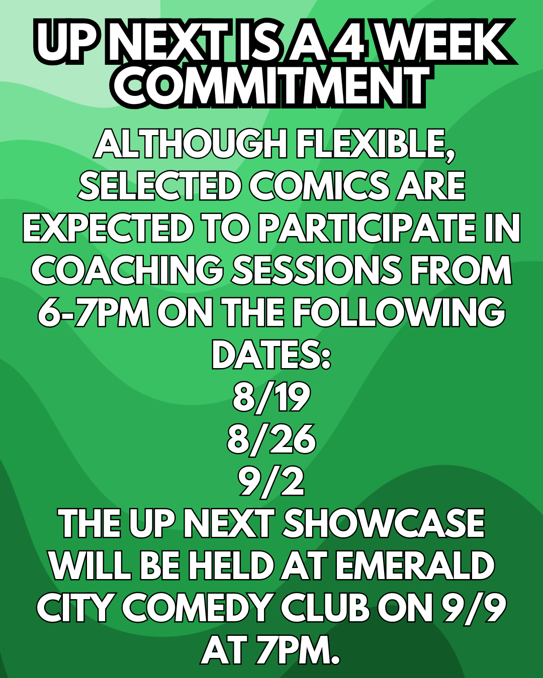 - Check the Website – Visit emeraldcitycomedy.com/calendar for scheduling details and to see who’s performing.
